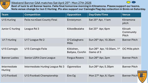 🟡🔵Weekend Banner fixtures this Weekend. 7 teams in action . Now that the good weather is here pls support our teams and our Camogie flag day collection in Ennis tomorrow . Big game in the morning for u15s in the Feile county final in Kilnamona .🟡🔵